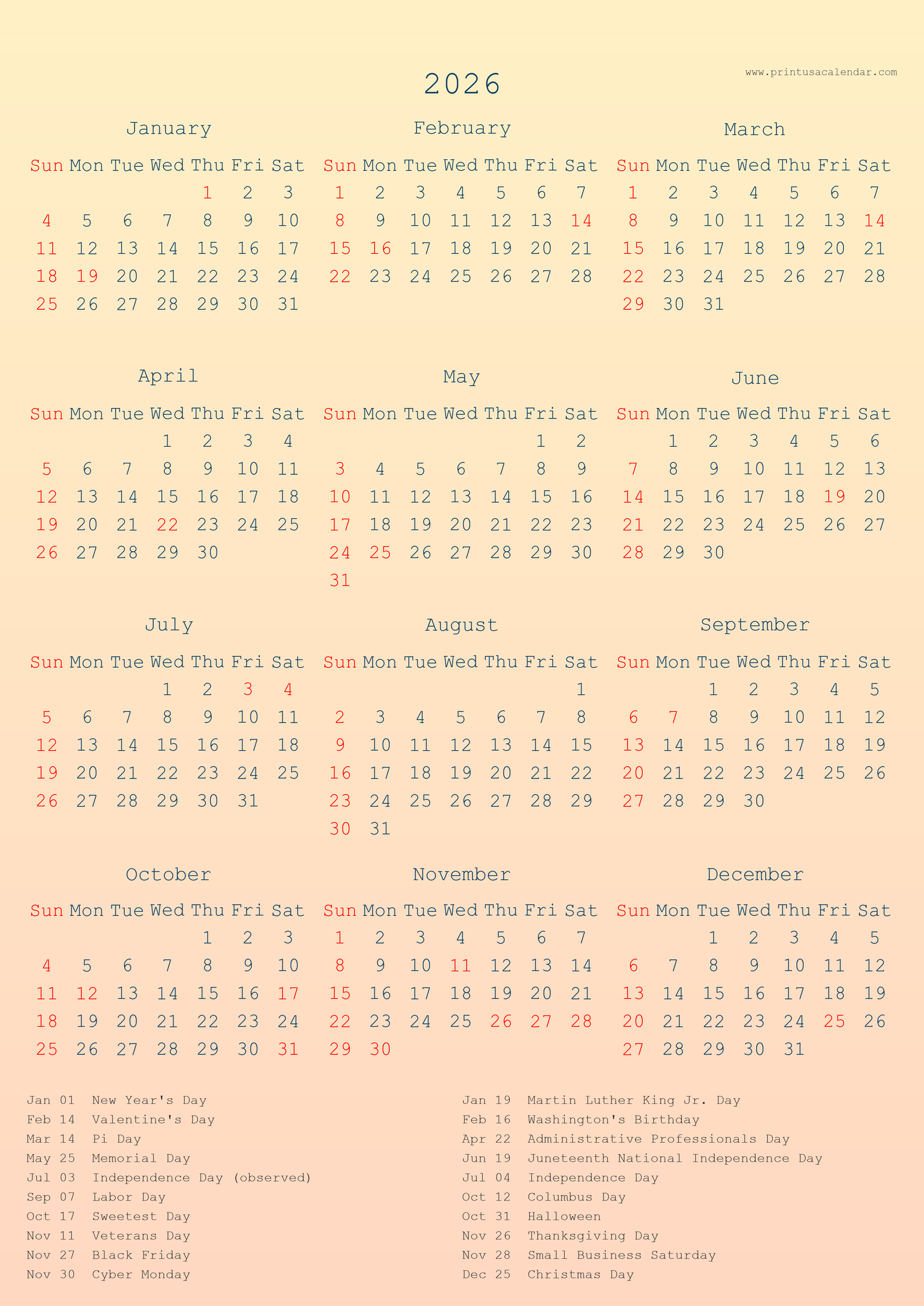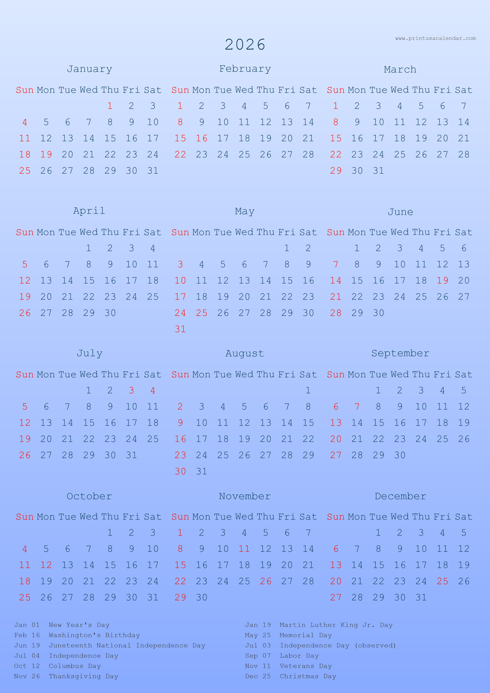 Printable 2026 US Calendars with holiday (PNG)