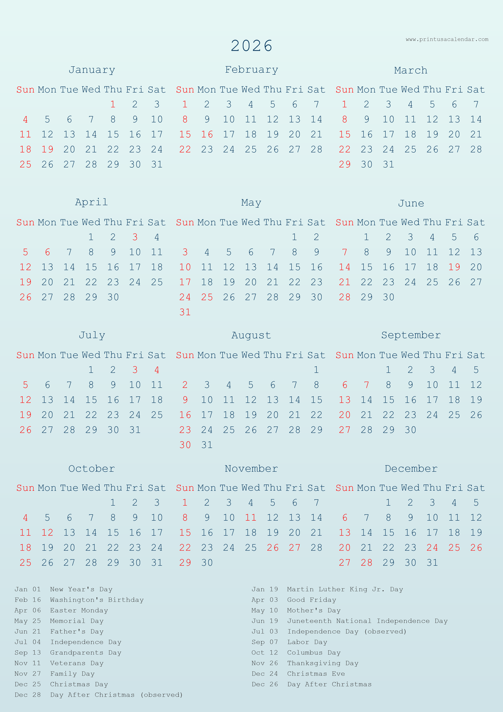 Calm Teal Long Federal Holidays And Observance