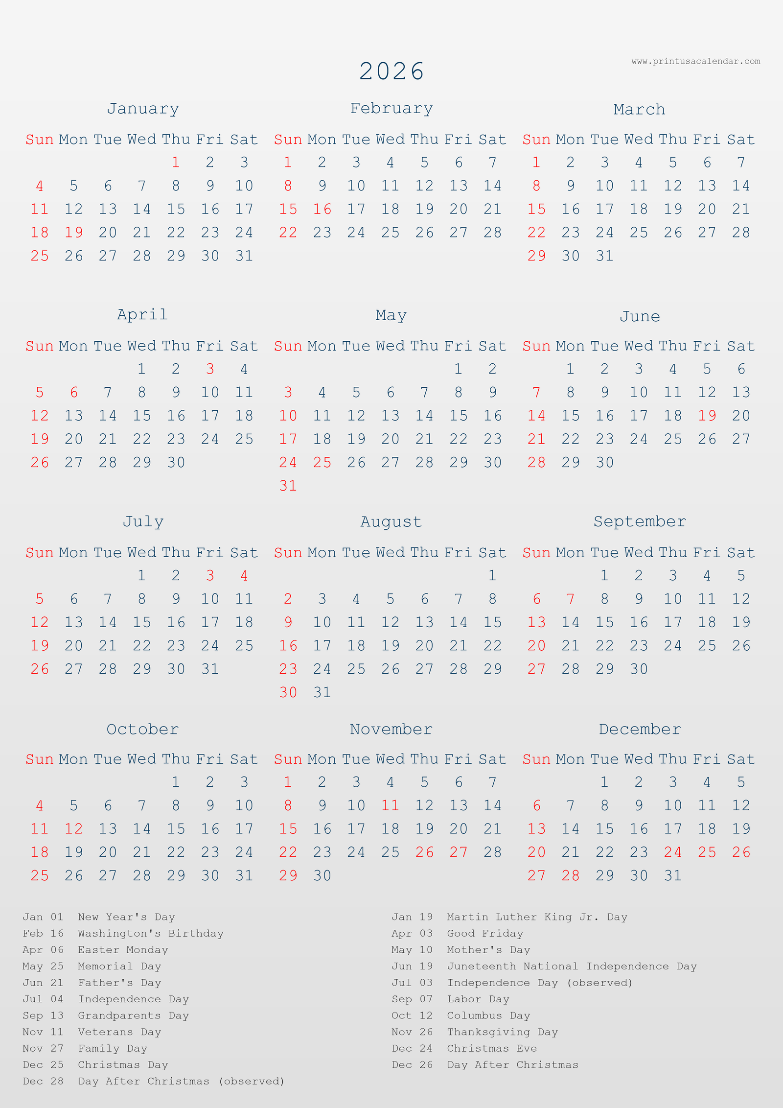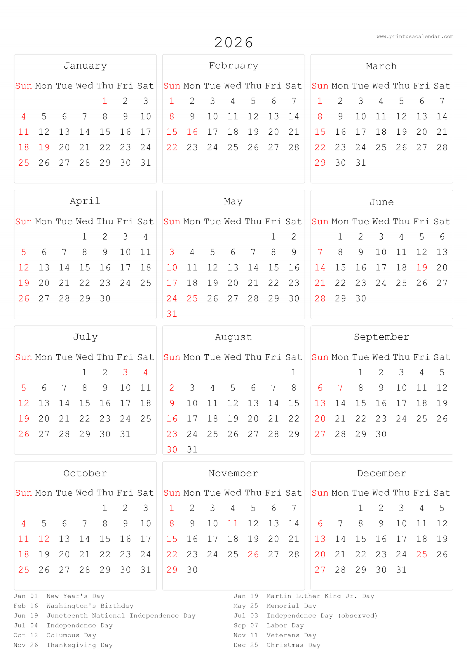 Minimalist printable 2026 calendars with holidays.