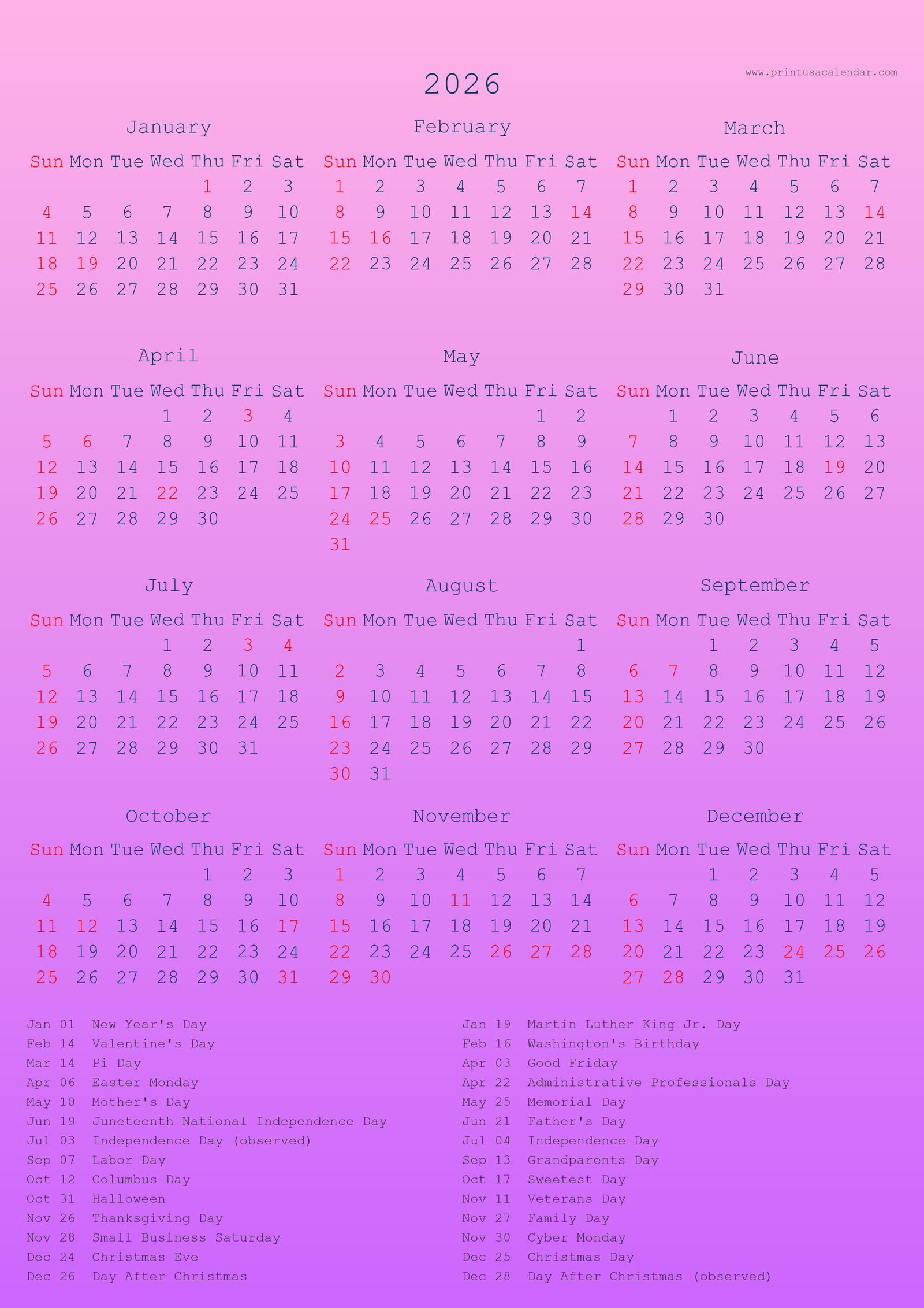 Pink Purple Federal Holidays And Observance