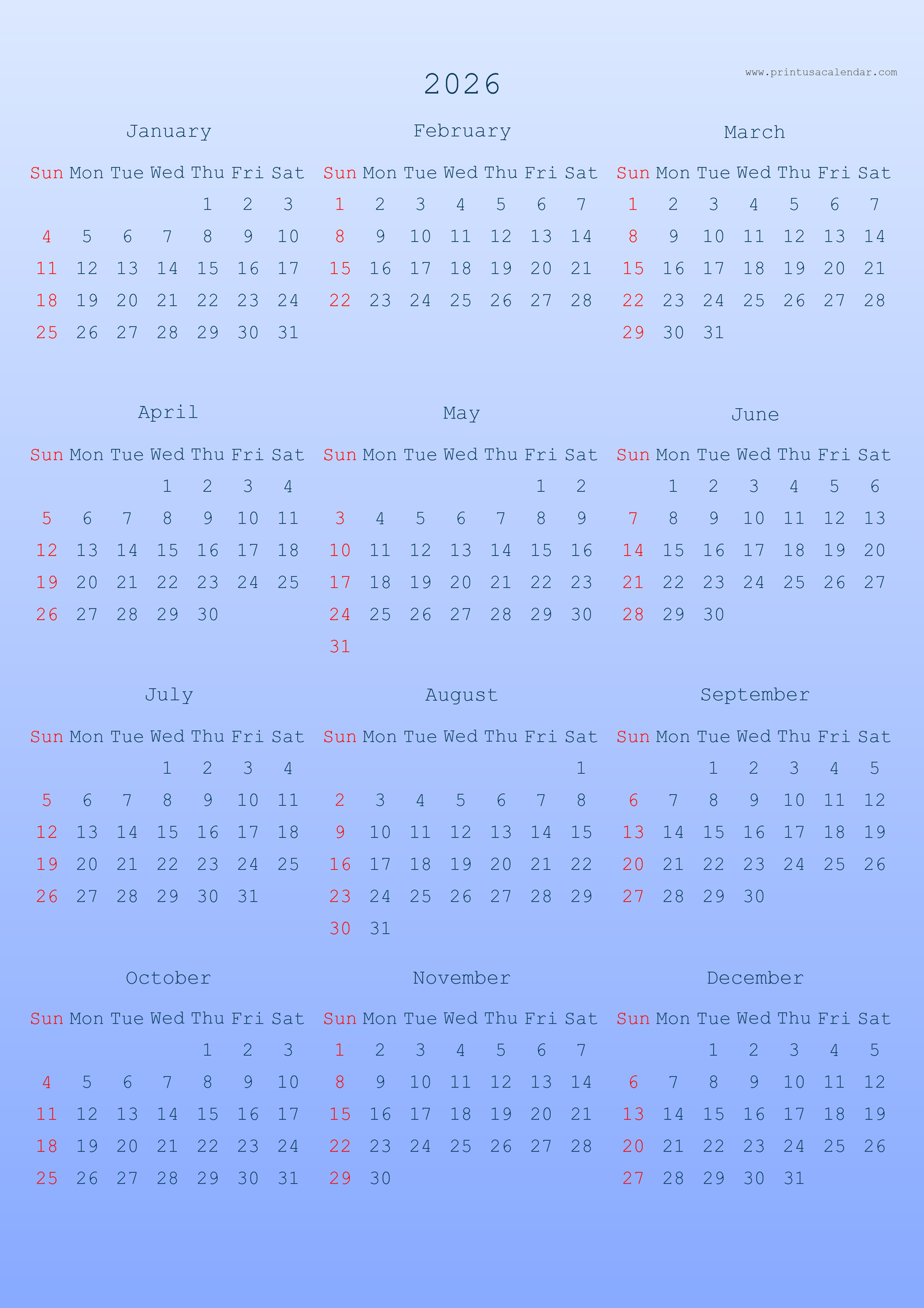 Simple Printable 2026 US Calendars (PNG)