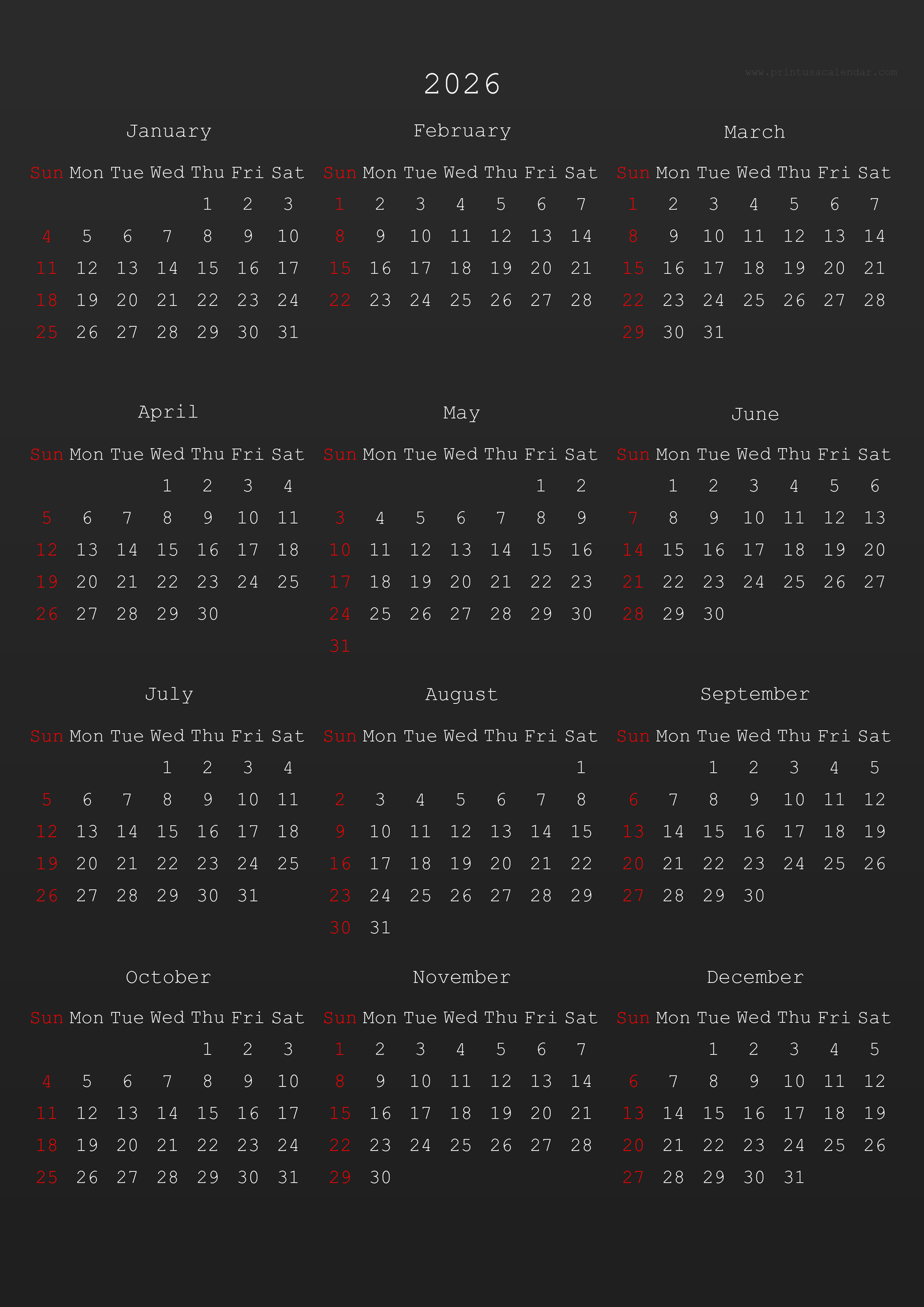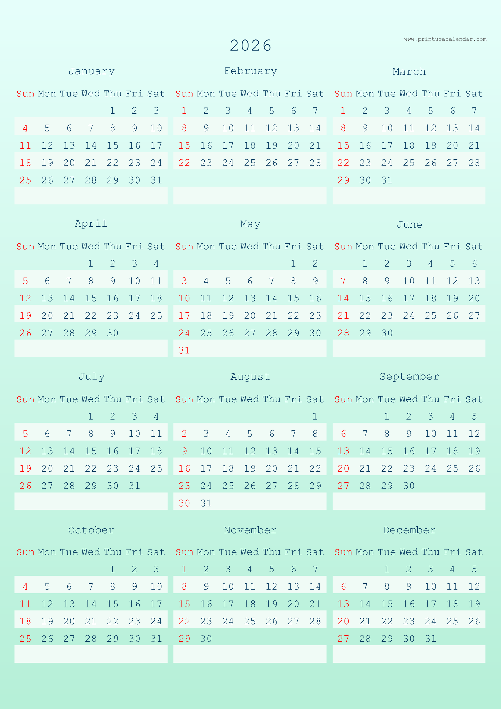 Minimalist printable 2026 calendars without holidays.