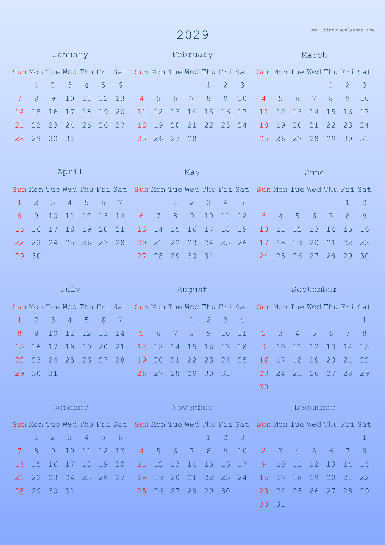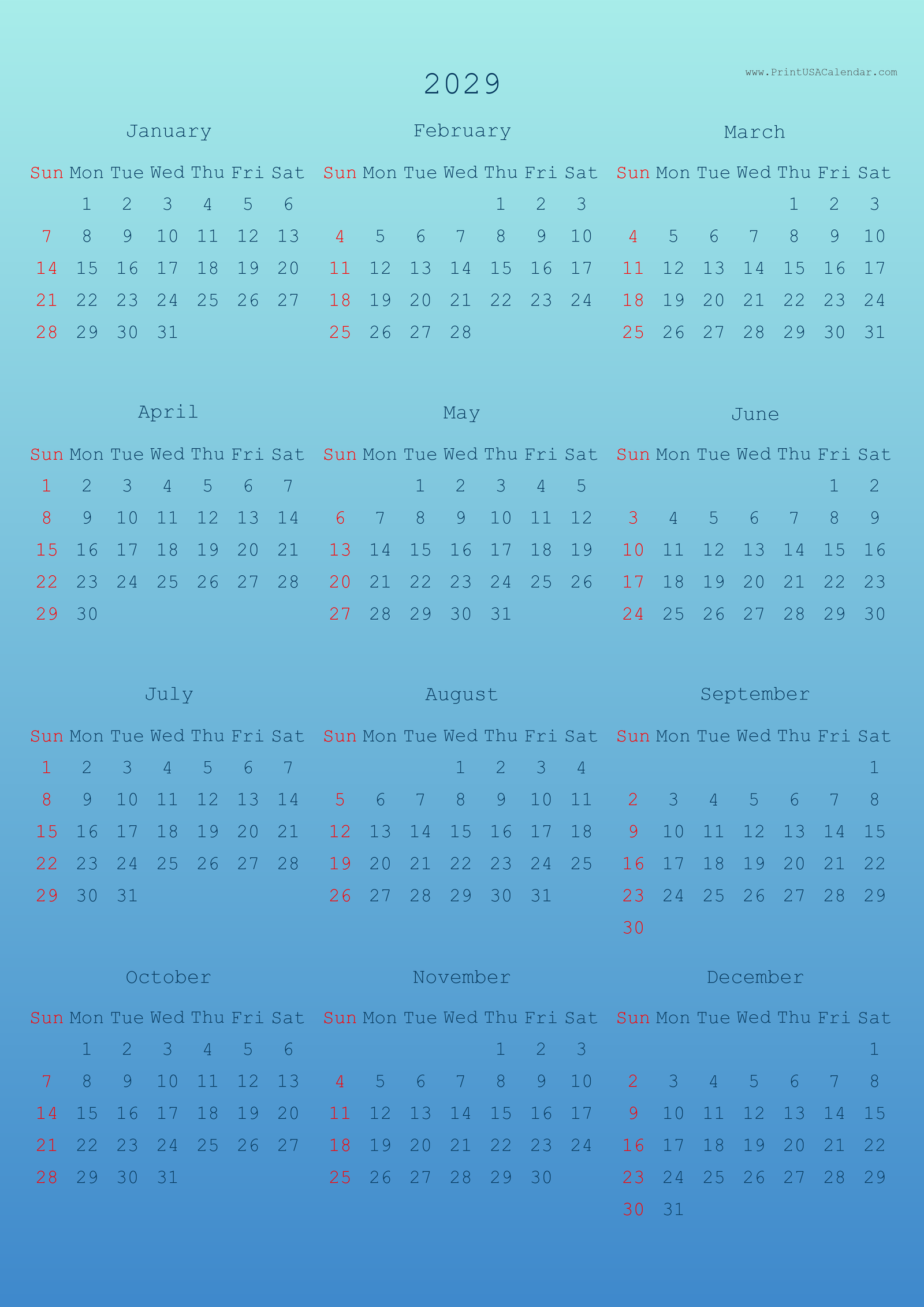 Minimalist printable 2029 calendars without holidays.