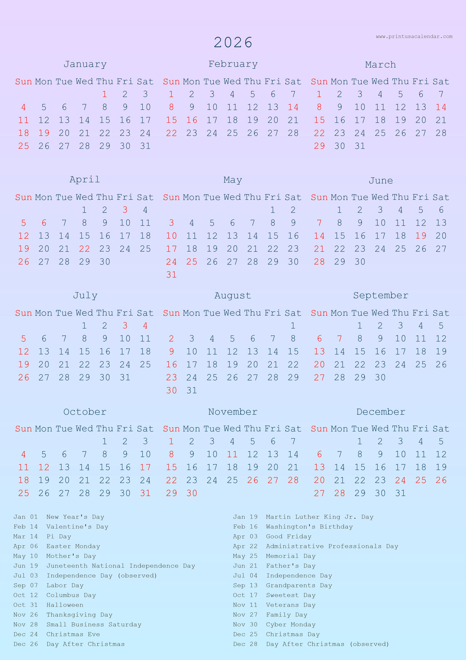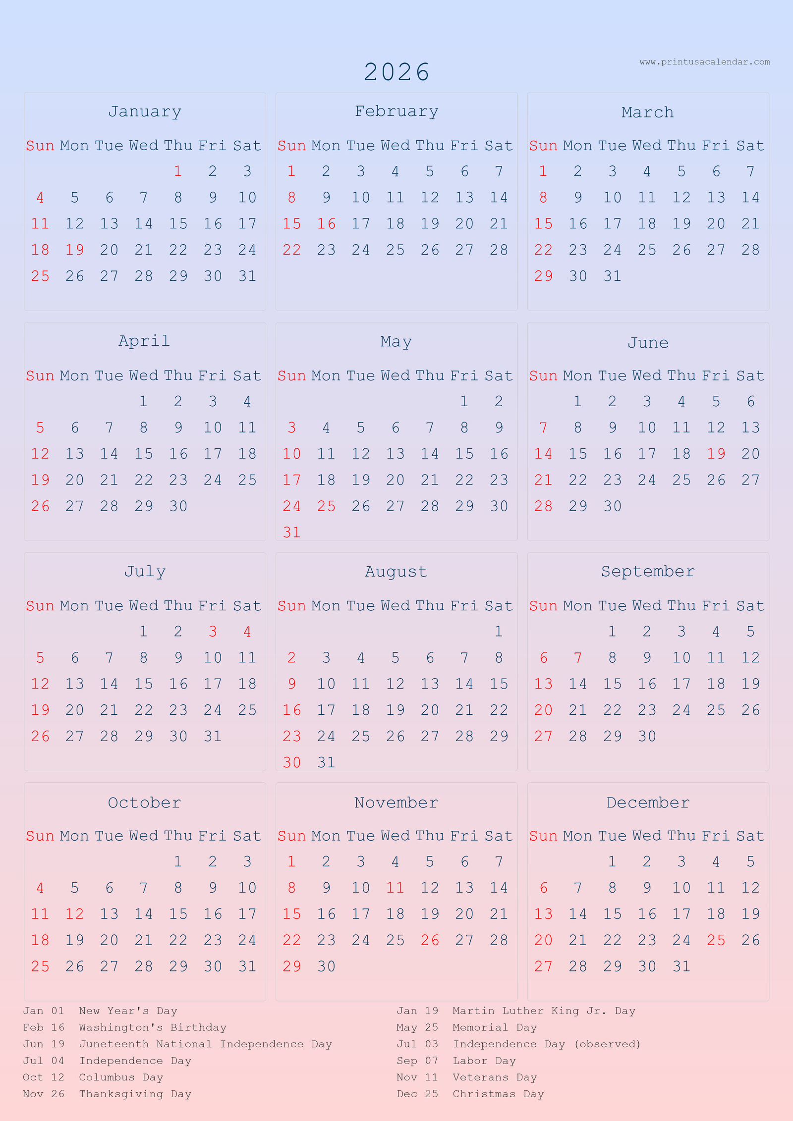Printable 2026 US Calendars with holiday (PNG)
