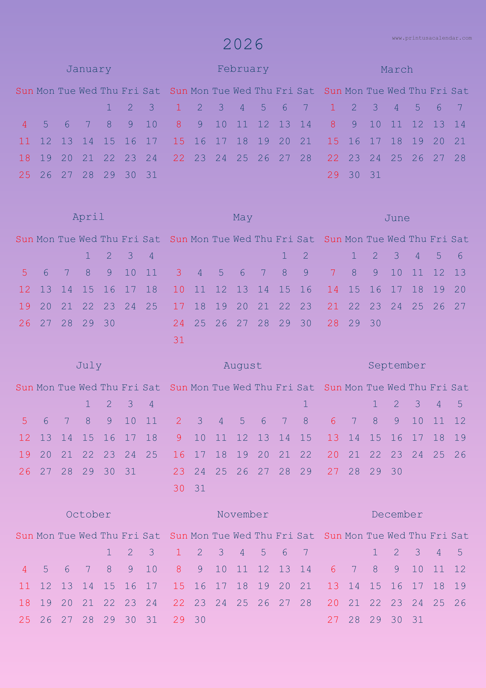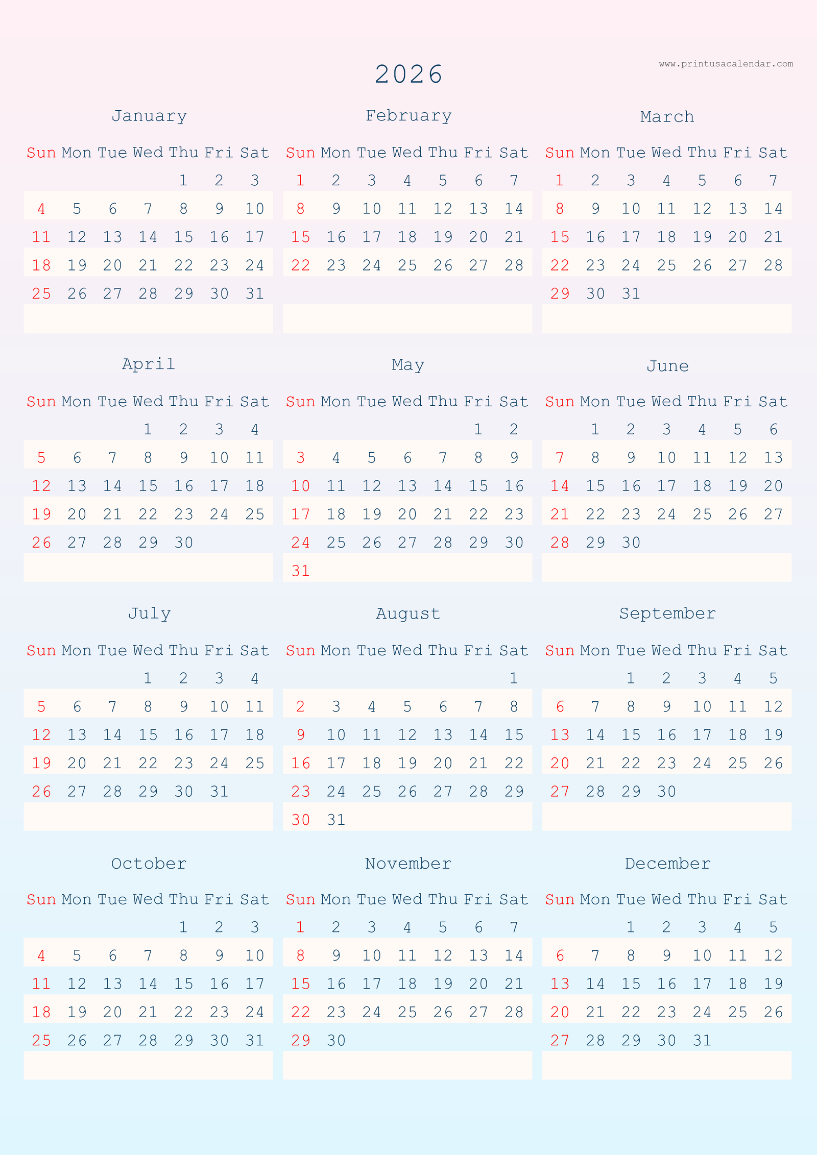 Minimalist printable 2026 calendars without holidays.