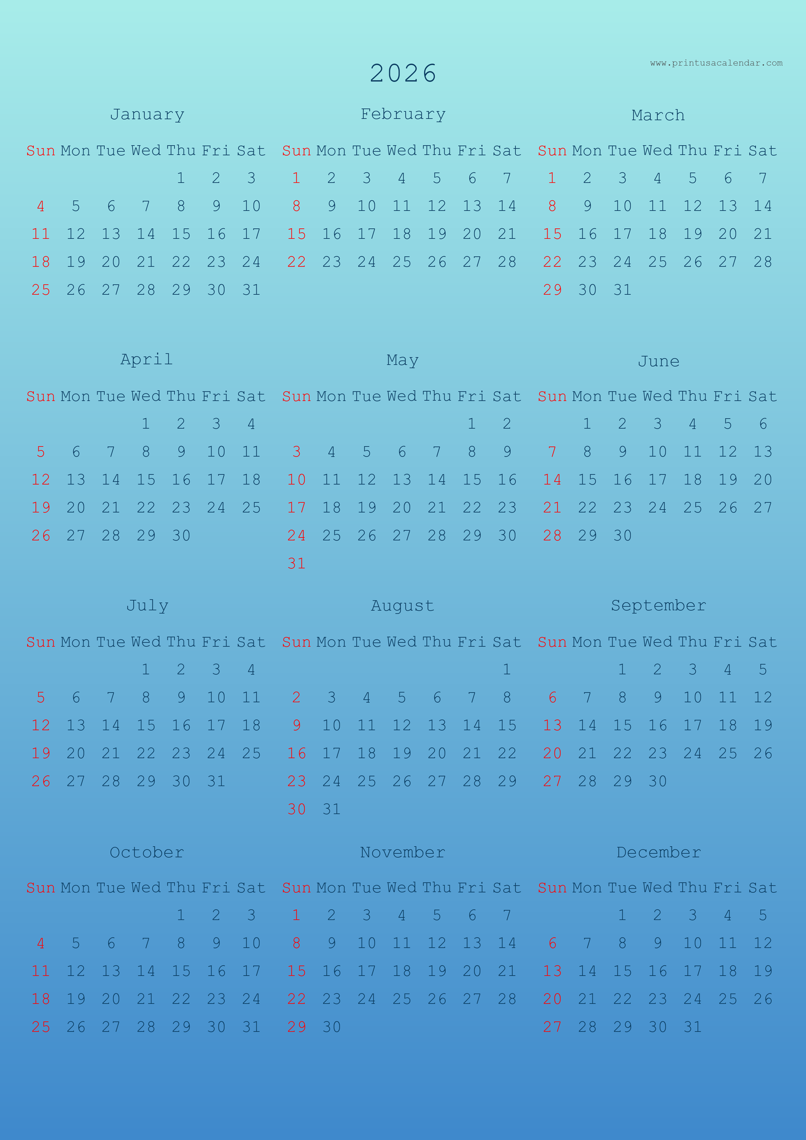 Simple Printable 2026 US Calendars (PNG)