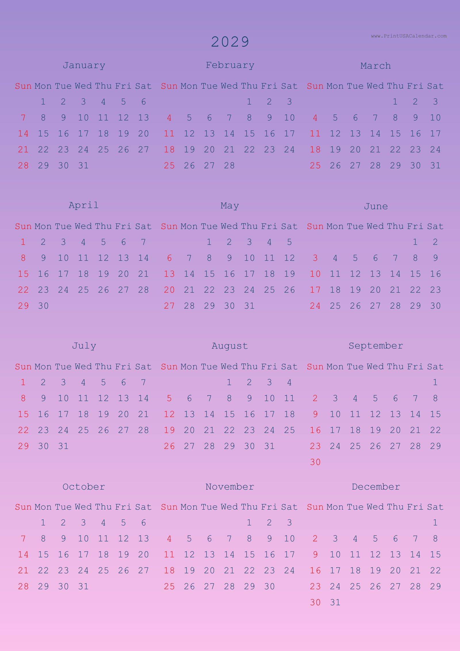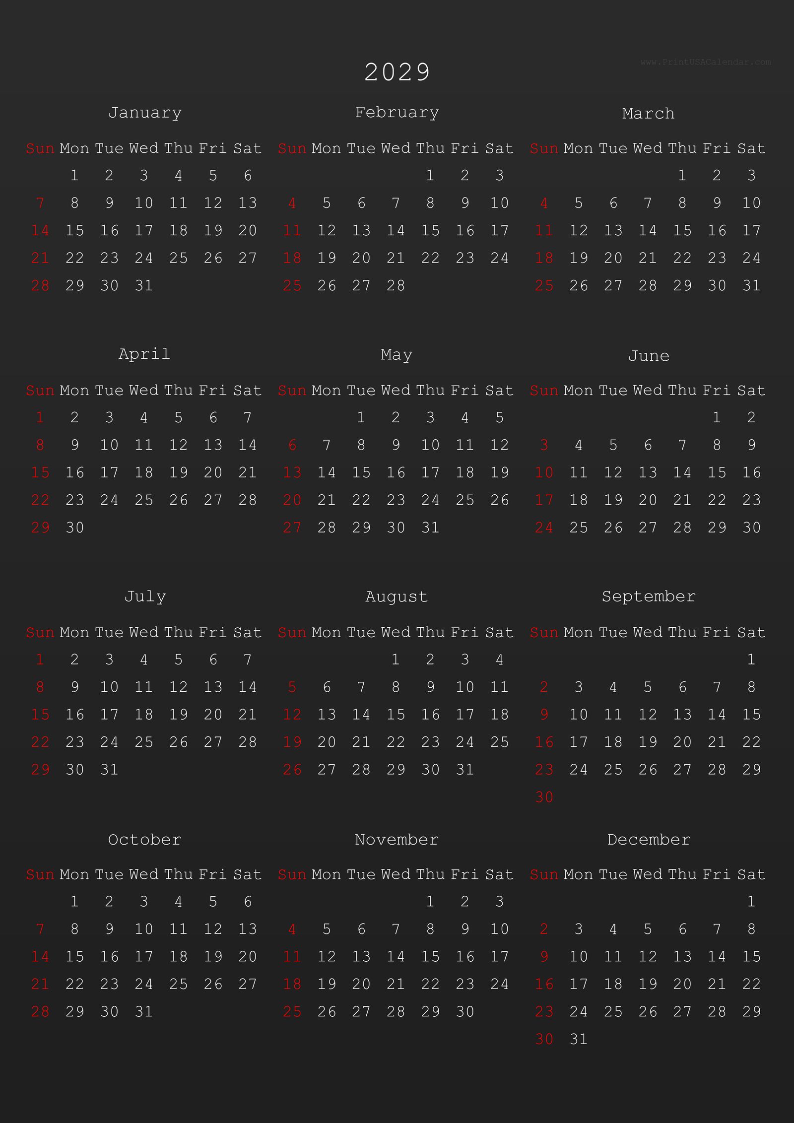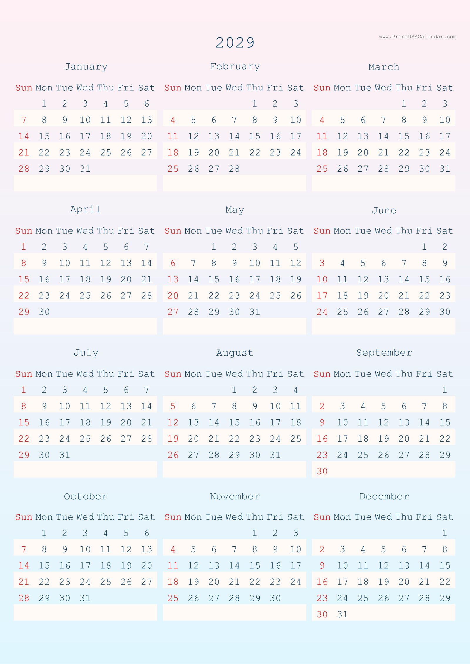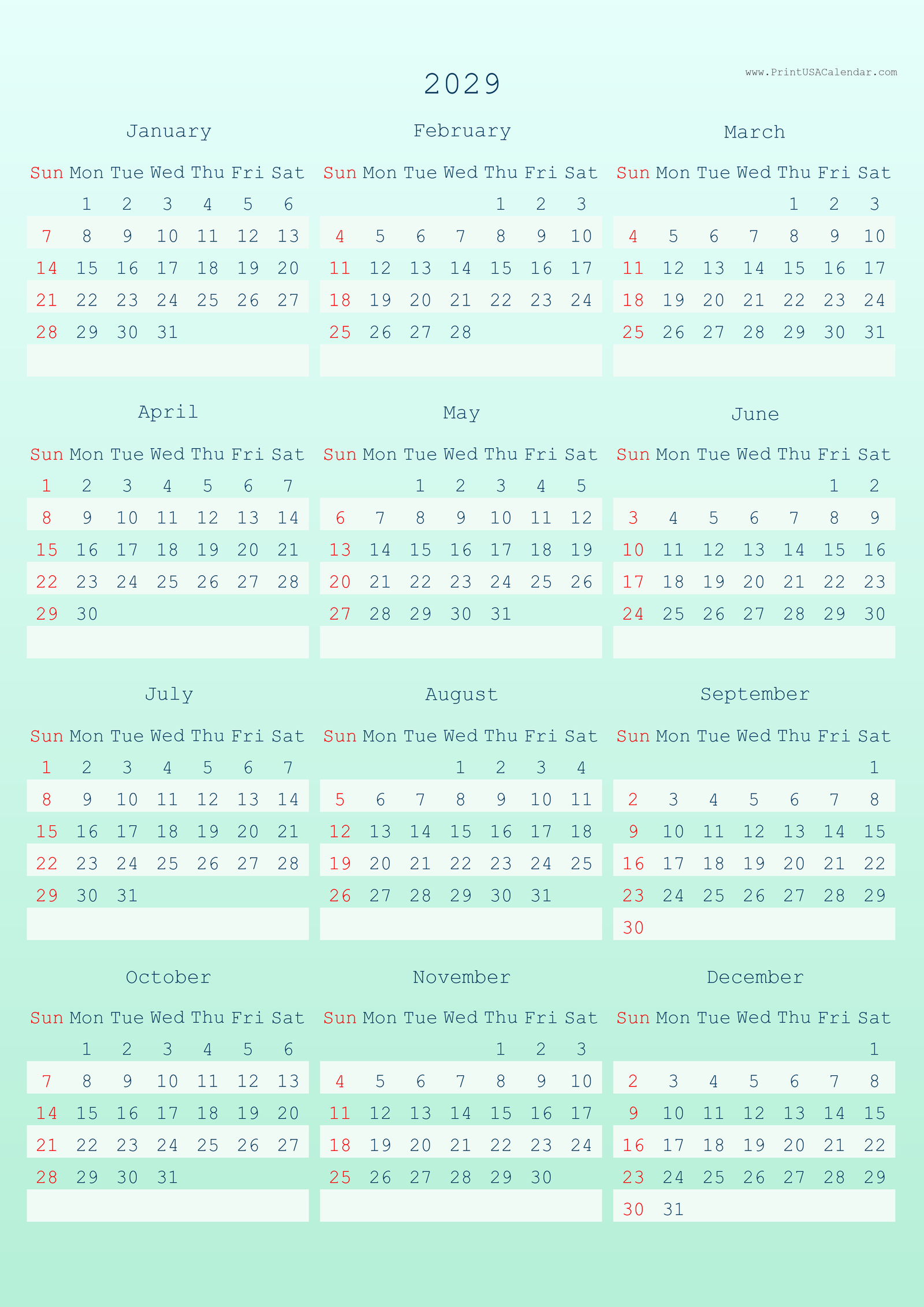 Minimalist printable 2029 calendars without holidays.
