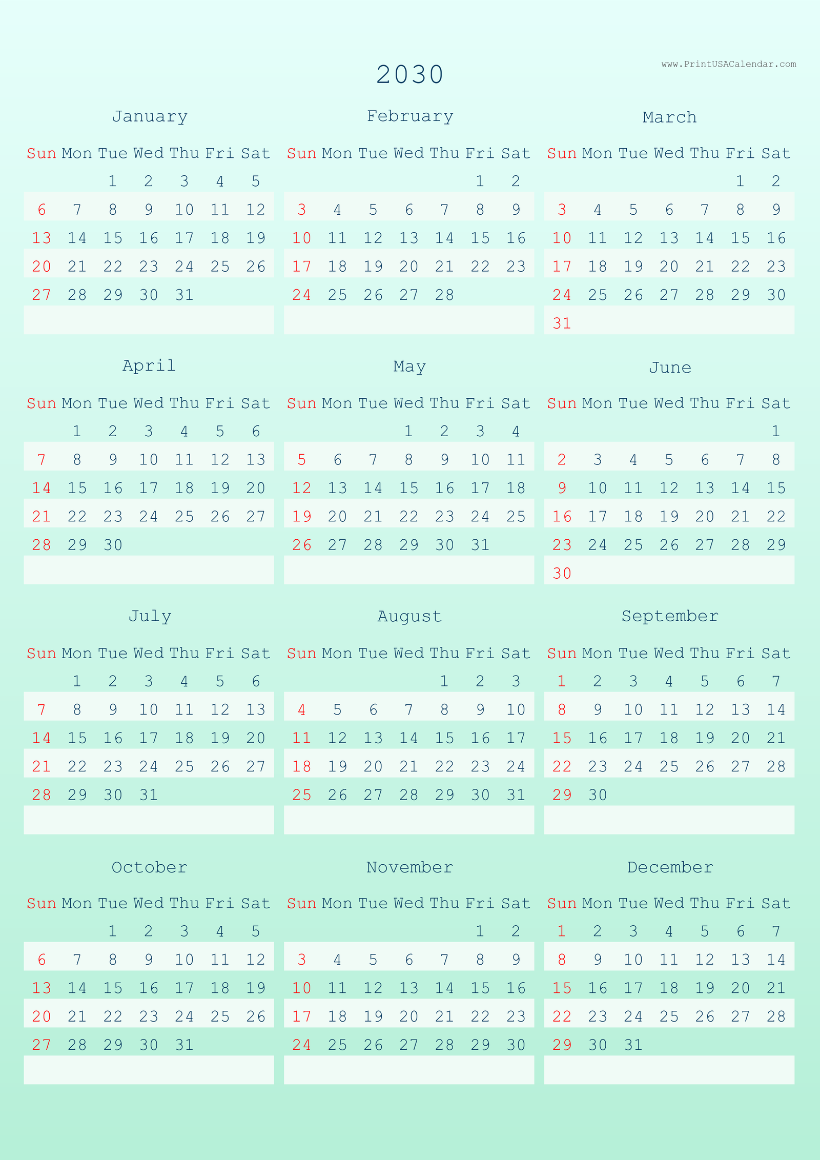 Minimalist printable 2030 calendars without holidays.